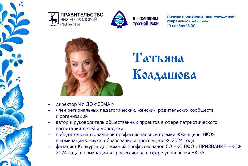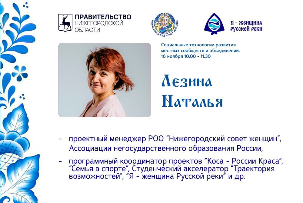 Завершился этап онлайн-семинаров регионального образовательного форума «Я – женщина Русской реки» для женских команд, представляющих территории Нижегородский области, расположенные на реке Оке. Проект реализуется РОО «Нижегородский совет женщин» при поддержке Правительства Нижегородской области на средства гранта в форме субсидии СО НКО.