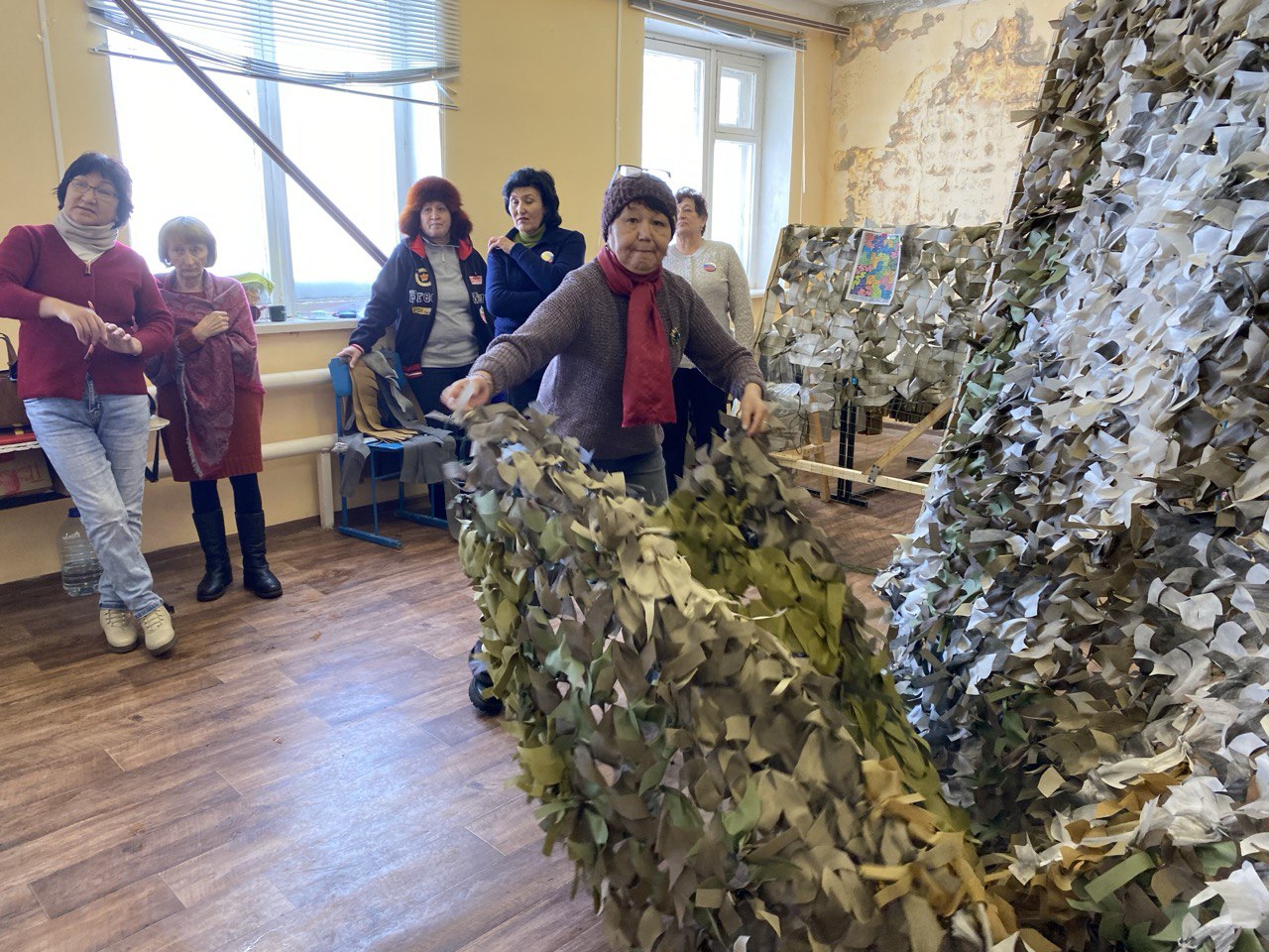 Вначале гости посетили пункт плетения маскировочных сетей. Под руководством члена Совета женщин Дергачевского района Татьяны Баймуратовой волонтеры работают над созданием 58-й по счету сети, которая вскоре отправится на передовую. Не остались в стороне и сами представители Таманской дивизии – они с энтузиазмом присоединились к работе. Ольга Беляева, продемонстрировала способ нарезки лент, показала, как важна каждая деталь в этом общем деле.