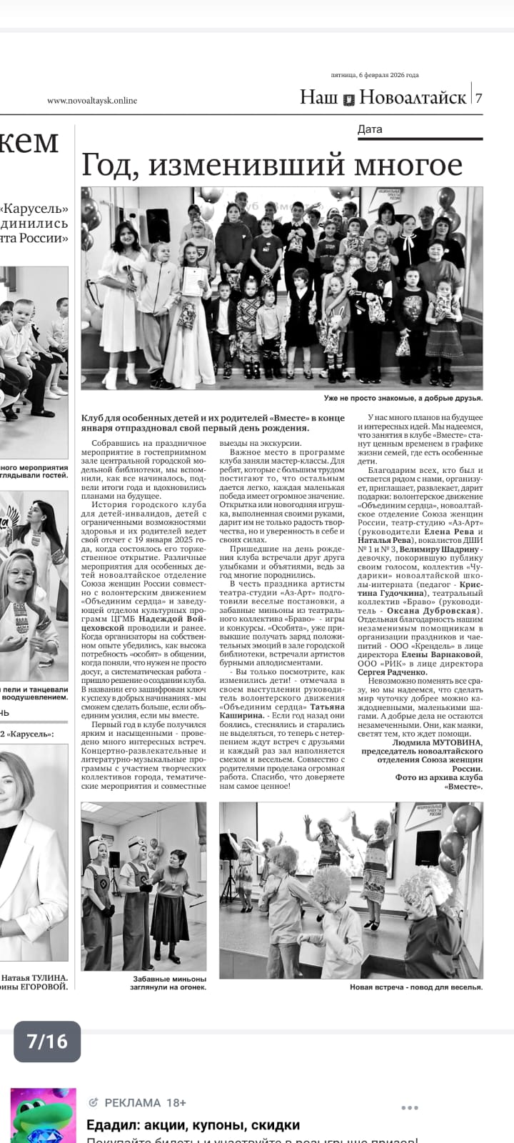 Совет женщин г. Новоалтайска под руководством Людмилы Мутовиной, совместно с волонтерским движением «Объединим сердца» создали Клуб для особенных детей и их родителей «Вместе». На днях объединение отметило свой первый день рождения.