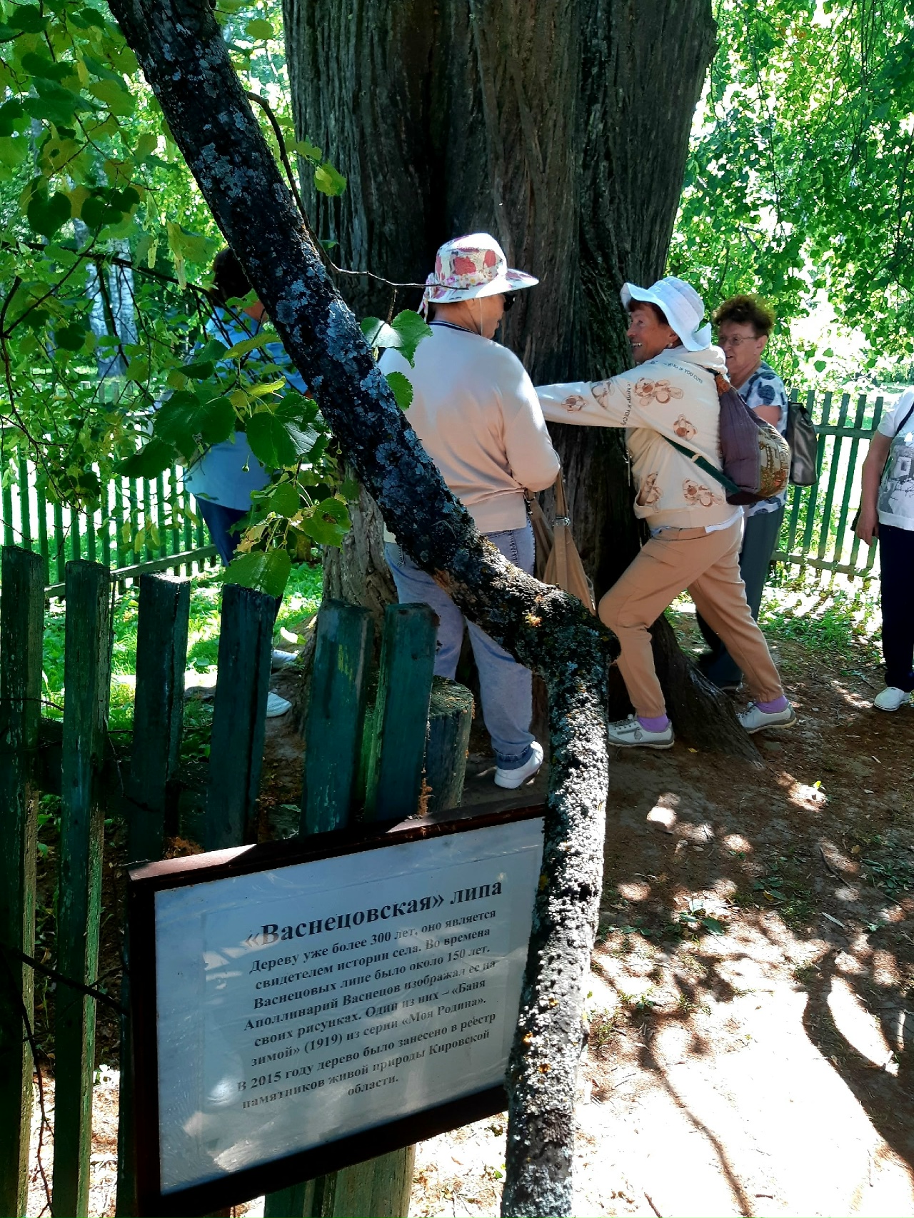 Экскурсовод Наталья Юрьевна Исупова провела увлекательную экскурсию по ухоженной территории Васнецовской усадьбы. Особое внимание привлекает взгляд могучая липа, которой свыше трехсот лет. Дерево было посажено задолго до переезда сюда семьи Васнецовых. Когда оно зацветает, то всю округу заливает упоительный запах меда.