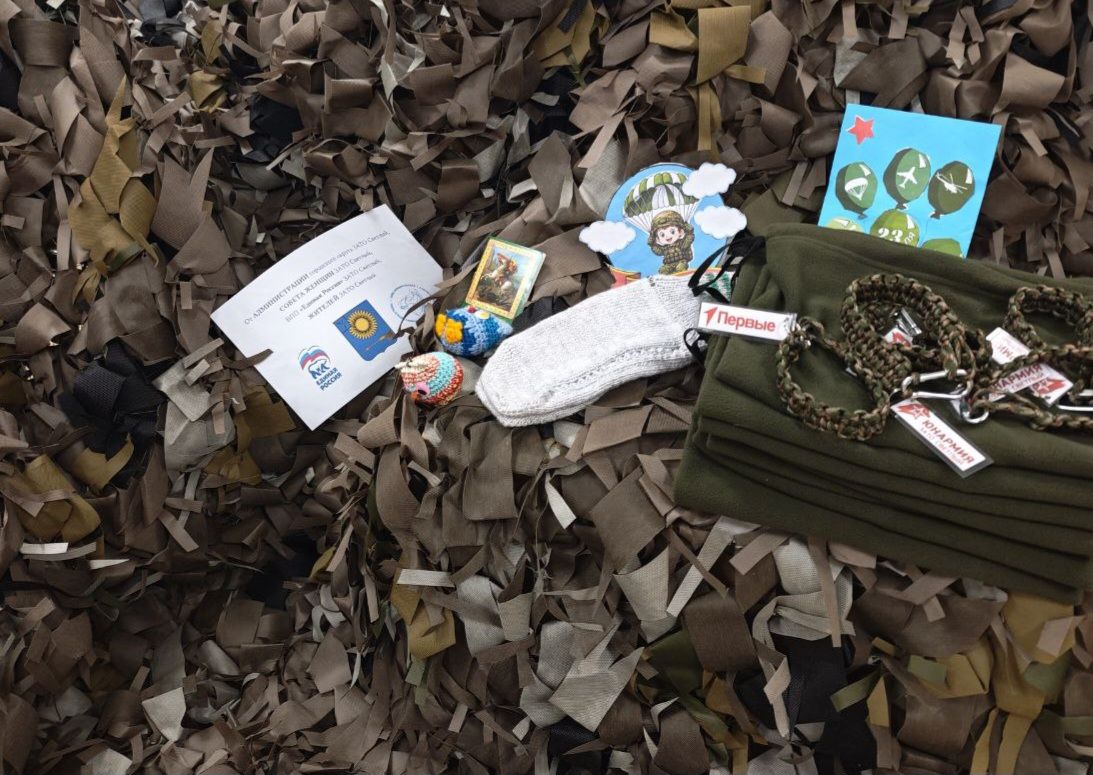 В очередную партию из пяти сетей завернули подарки: сувениры от объединения художественного вязания Дома детского творчества, браслеты выживания от "Движения Первых" и Юнармии, детские письма.