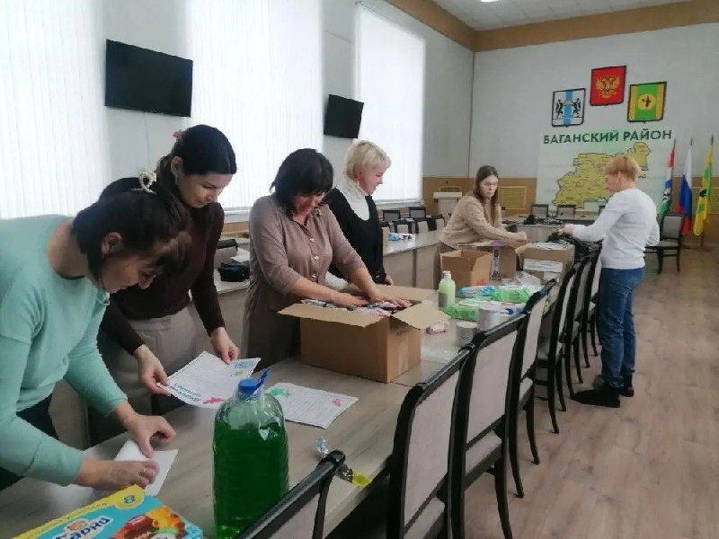 - Совет женщин Баганского района в очередной раз подготовил посылки для военнослужащих, в состав которых вошли окопные свечи, маскировочные сети, различные вкусности, теплые носки от рукодельниц, а также письма с поздравлениями от местных школьников.