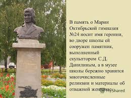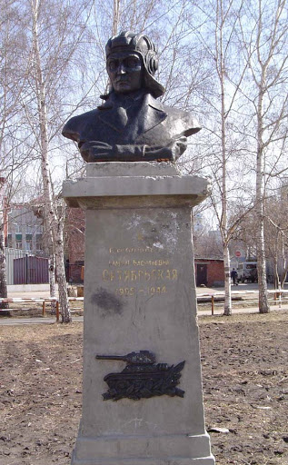 Мария Васильевна Октябрьская — танкист, Герой Советского Союза. В 1941 году вместе с другими членами семей офицеров была отправлена в эвакуацию в Томск, где работала телефонисткой в артиллерийском училище. Получив похоронку на мужа, продала все вещи и ценности, внесла 50 000 рублей на строительство танка Т-34 и написала письмо Сталину с просьбой отправить ее на фронт в качестве водителя этого танка. С октября 1943 года на своем танке «Боевая подруга» воевала на Западном фронте. В январе 1944 года получила тяжелое ранение в бою у станции Крынки Витебской области и затем скончалась во фронтовом госпитале. Звание Героя Советского Союза получила посмертно. Похоронена в сквере Памяти героев в Смоленске.
