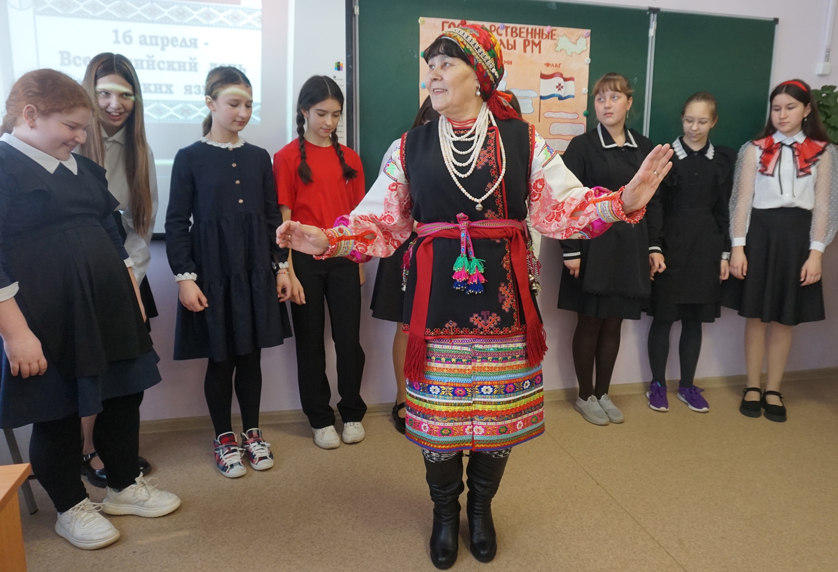 Мария Петровна (учитель школы имени Героя Советского Союза А. И. Семикова, руководитель районной общественной организации мордовского народа, член Темниковского женсовета) не только ответила на вопросы детей, но и провела увлекательный мастер-класс, продемонстрировав, как язык может быть живым и очень мелодичным.