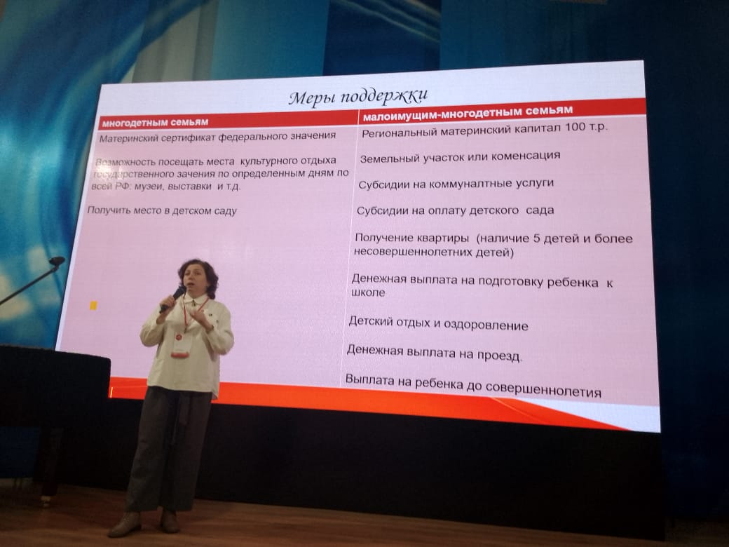 Председатель Клуба многодетных семей Ленинского района города Томска, член КС при мэре Томска, общественный помощник Уполномоченного по правам ребёнка Тамара Щербинина представила доклад на тему "Совершенствование социальных гарантий для многодетных семей в свете развития и поддержки института семейных ценностей". Она рассказала о проблемах, с которыми сталкиваются многодетные семьи, у которых доход на одного члена семьи превышает прожиточный минимум на незначительную сумму, и внесла предложения, которые требуют решения на законодательном уровне.