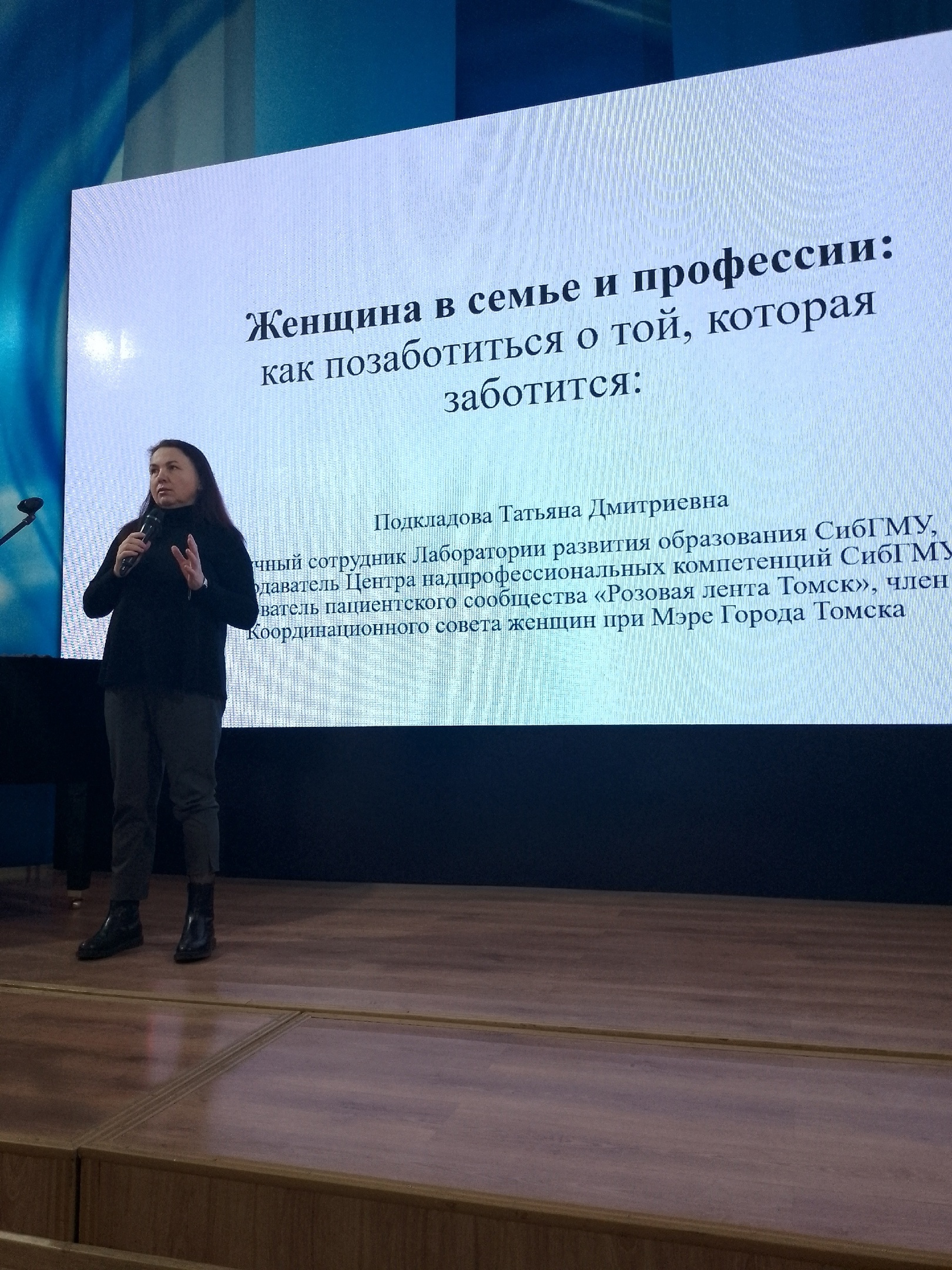 Научный сотрудник Лаборатории развития образования СибГМУ, член КС при мэре Томска Татьяна Воронина рассказала, как заботится о той, которая заботится. Тема ее выступления звучала так: "Женщина в семье и профессии".