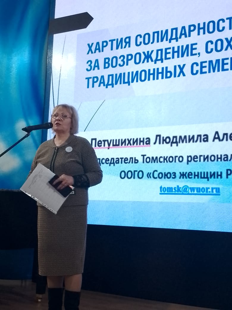 В рамках Фестиваля прошёл круглый стол, посвящённый актуальным проблемам семьи и сохранению семейных нравственных ценностей. Одним из спикеров мероприятия стала председатель Томского регионального отделения Союза женщин России Людмила Петушихина. Лидер РО СЖР познакомила собравшихся с Хартией солидарности за возрождение, сохранение и защиту традиционных семейных ценностей», инициированной Общероссийской общественно-государственной организацией «Союз женщин России». Людмила Александровна отметила, что документ открыт для присоединения общероссийских, региональных, межрегиональных и местных общественных объединений, общественных деятелей и граждан с активной жизненной позицией и призвала всех участников Фестиваля подписать Хартию во время Фестиваля подписных листах либо на официальном сайте СЖР и в социальных сетях. Л.А. Петушихина проинформировала участников круглого стола, что на 1 ноября в Томской области к Хартии присоединились более 5 тысяч человек. Работа продолжается.