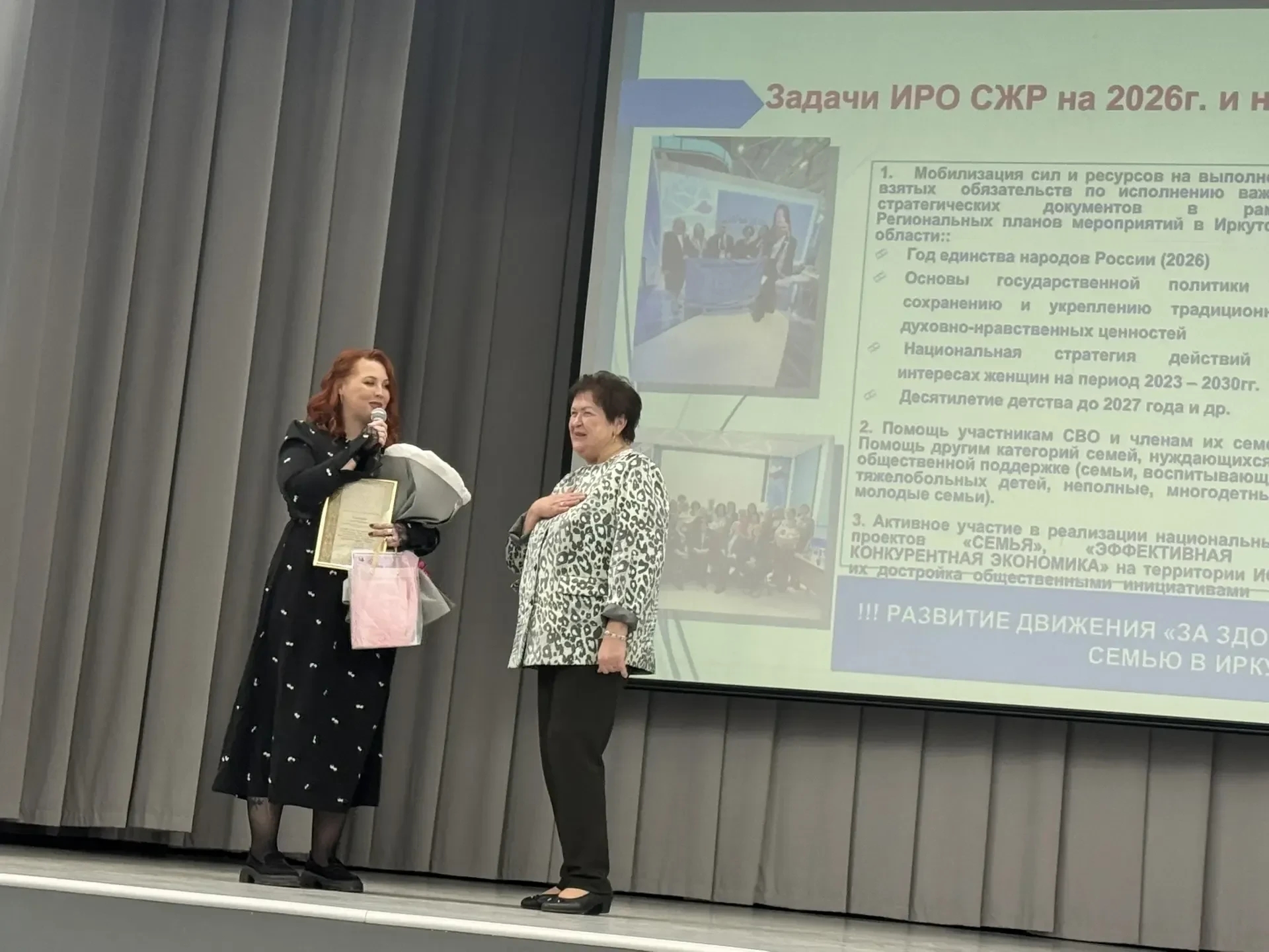 Галина Терентьева пожелала участницам Форума плодотворной работы и отметила особенность 2026 года, ознаменованного значимыми юбилейными датами: 85-летием Антифашистского комитета советских женщин и 50-летием Иркутского областного совета женщин, дополнив свое выступление показом фильма о Всероссийской общественно-государственной организации «Союз женщин России».