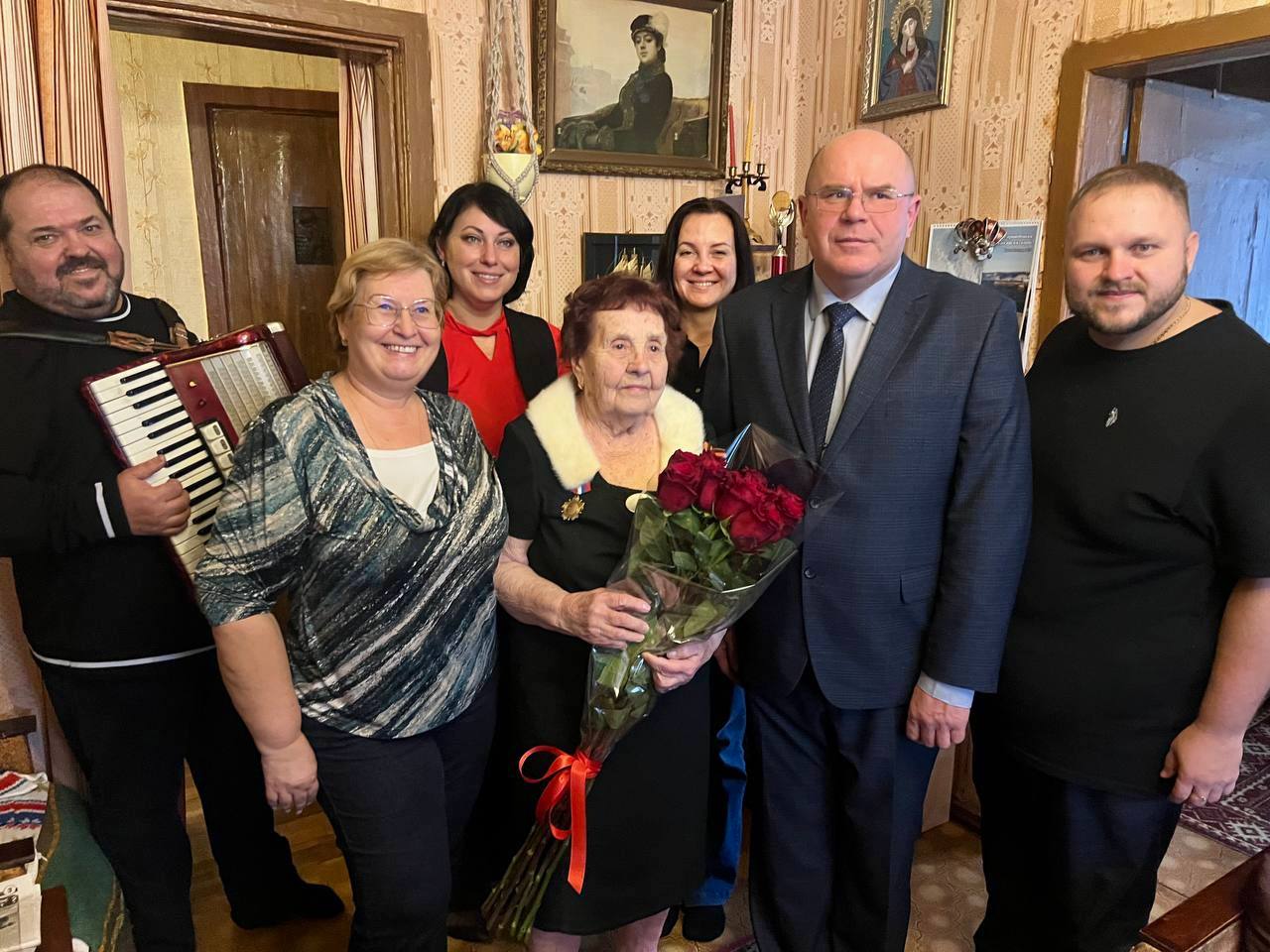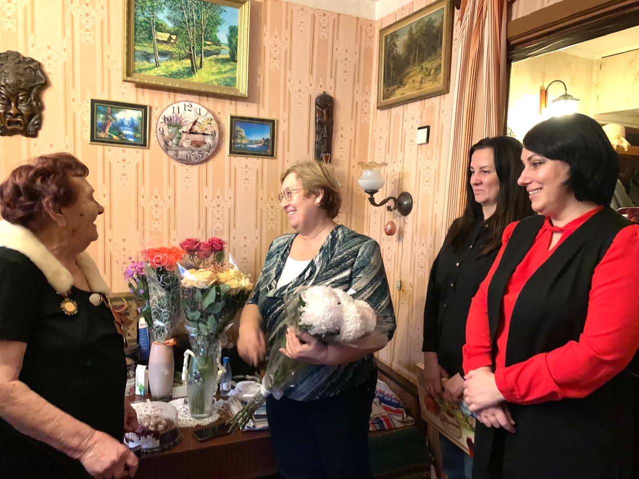 Активистки Совета женщин Энгельсского муниципального района Елена Шевчук (председатель организации), Василиса Фатхлисламова и Наталья Федорова вместе с исполнительным секретарем местного отделения партии «Единая Россия» и депутатом городского совета, участником специальной военной операции навестили и тепло поздравили со столетним юбилеем Лидию Николаевну Лопухову.