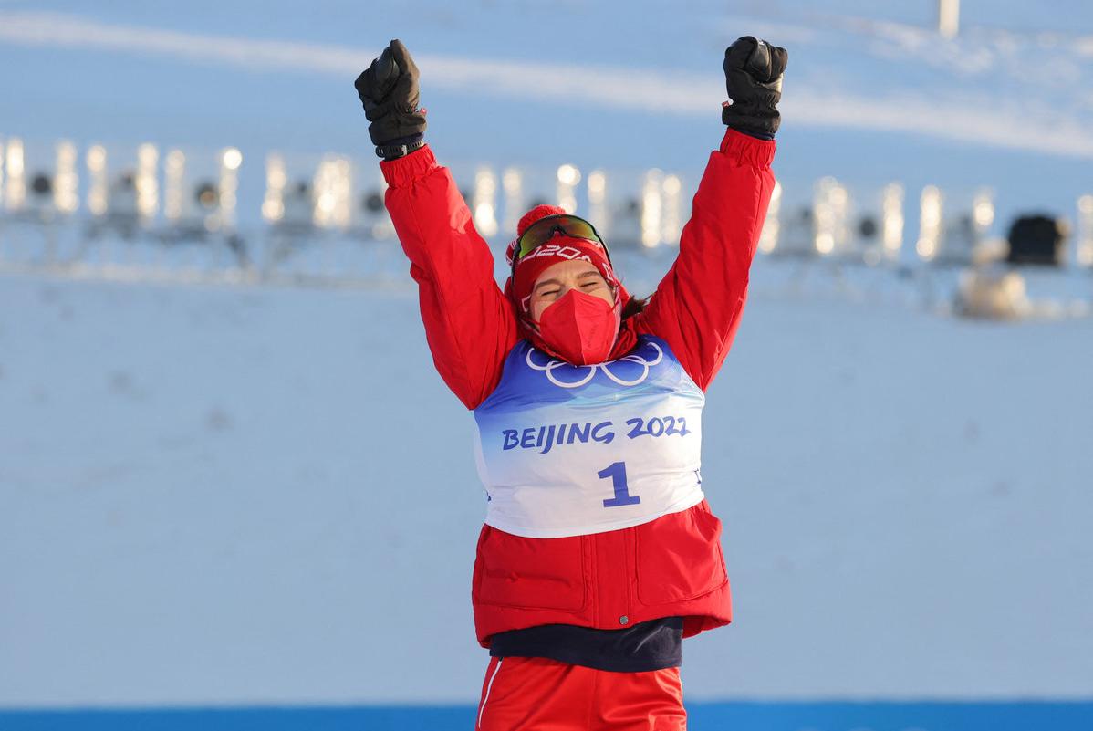 Фото: Reuters Чжанцзякоу. Наталья Непряева празднует серебро в скиатлоне Олимпиады-2022.