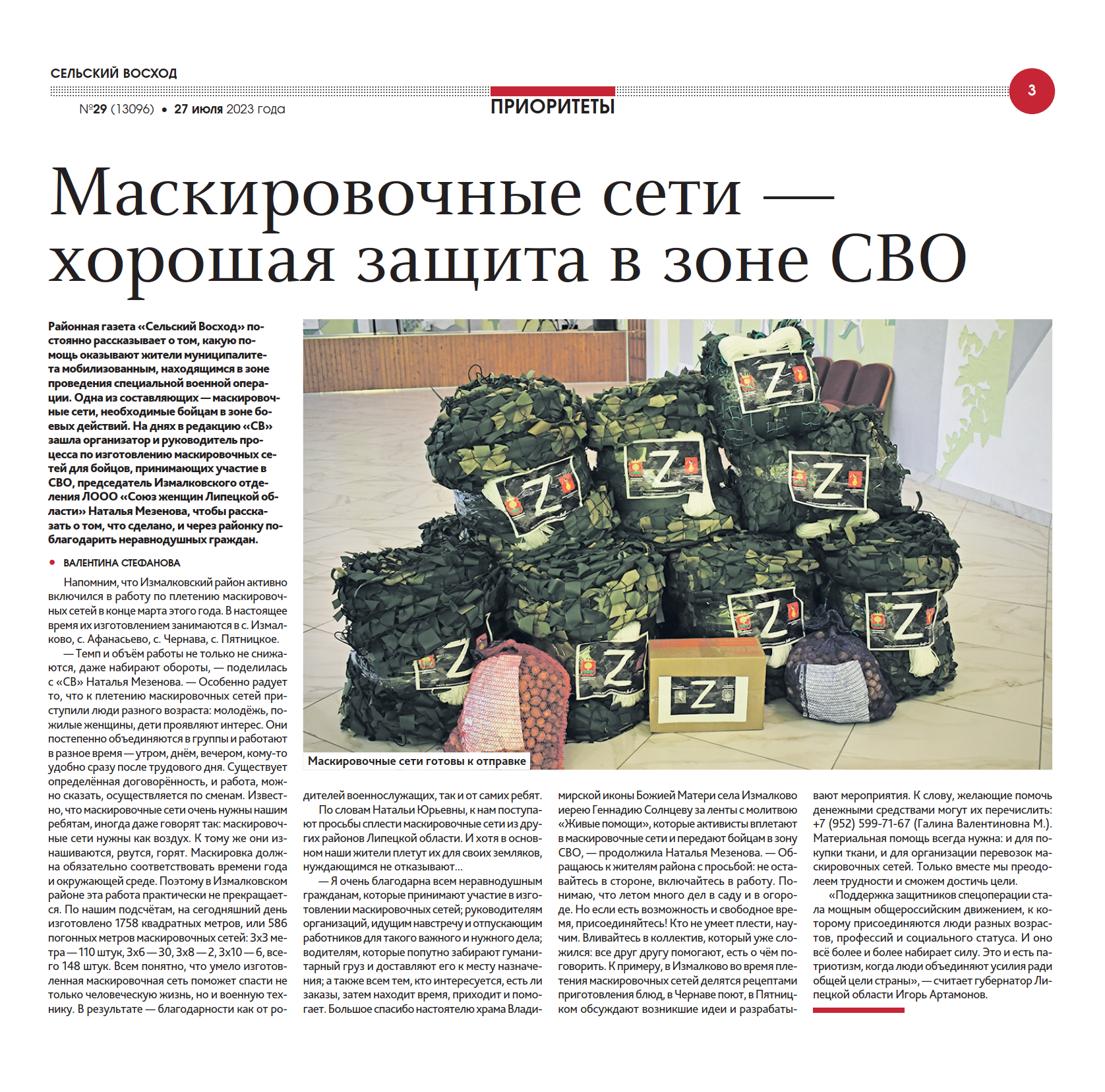 Маскировочные сети - хорошая защита в зоне СВО (газета "Сельский восход" от 27.07.2023)