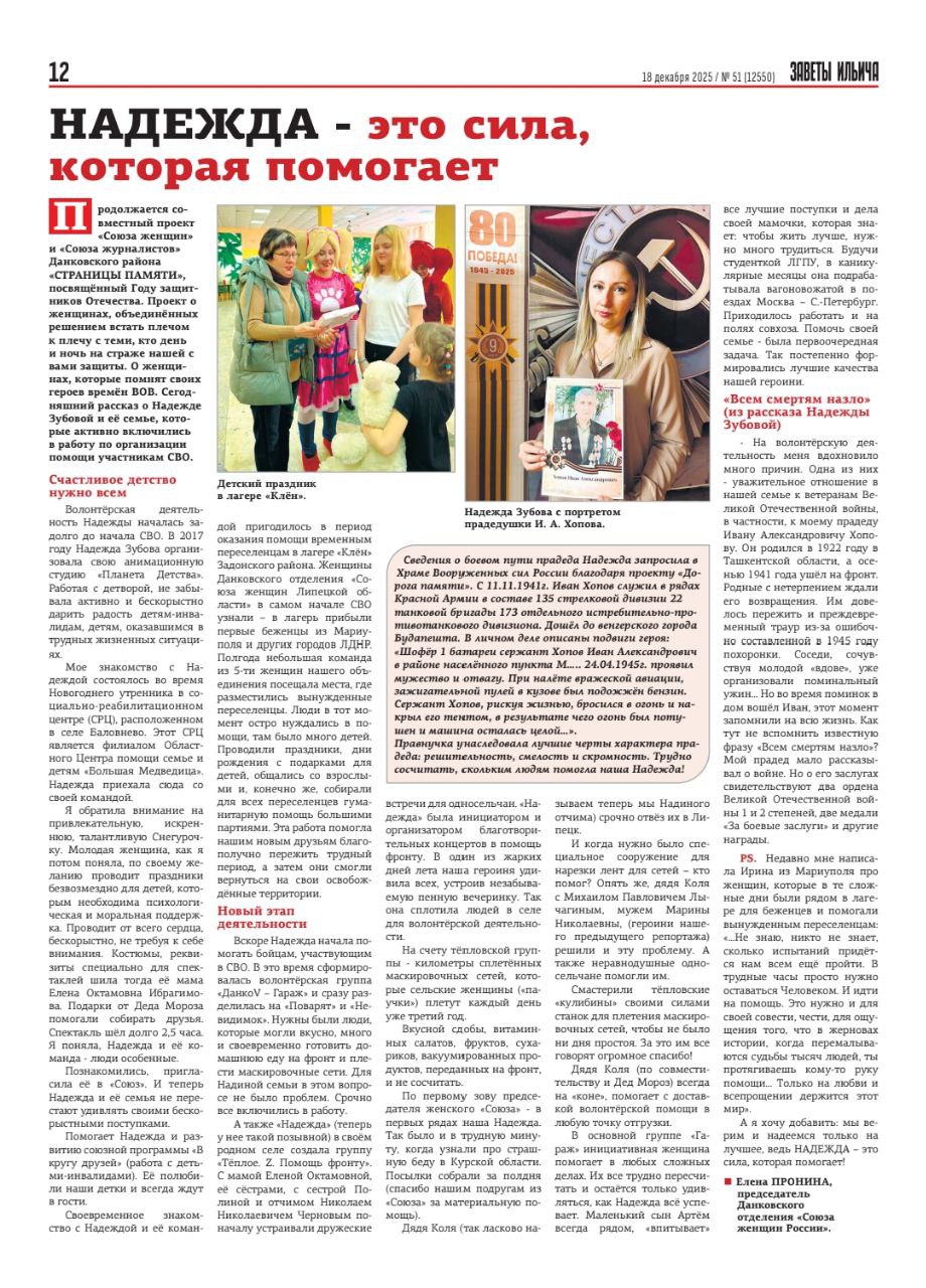 Продолжается совместный проект Союза женщин и Союза журналистов Данковского района «Страницы памяти», посвящённый Году защитников Отечества. Проект о женщинах, объединённых решением встать плечом к плечу с теми, кто день и ночь на страже нашей с вами защиты. О женщинах, которые помнят своих героев времён Великой Отечественной войны.