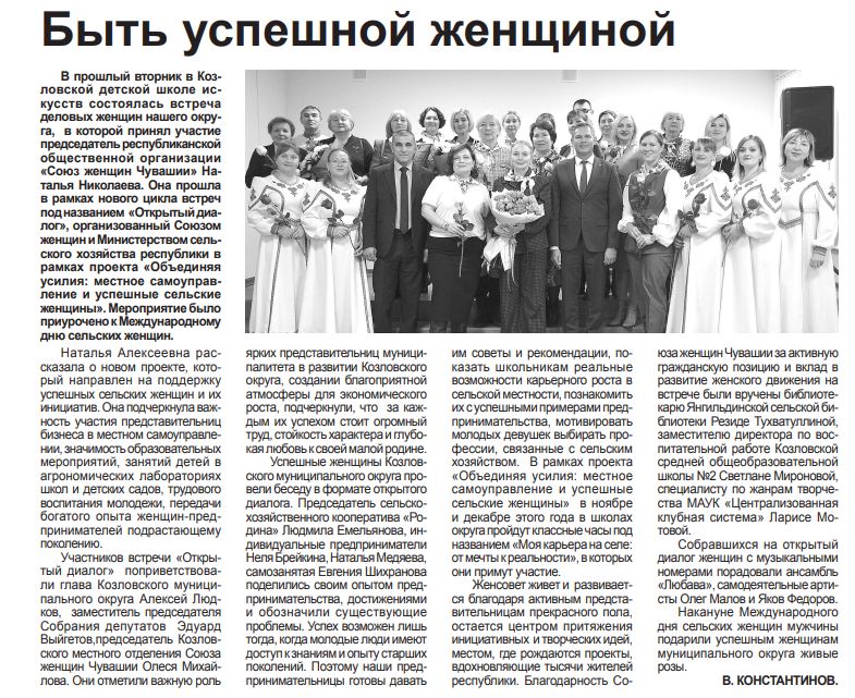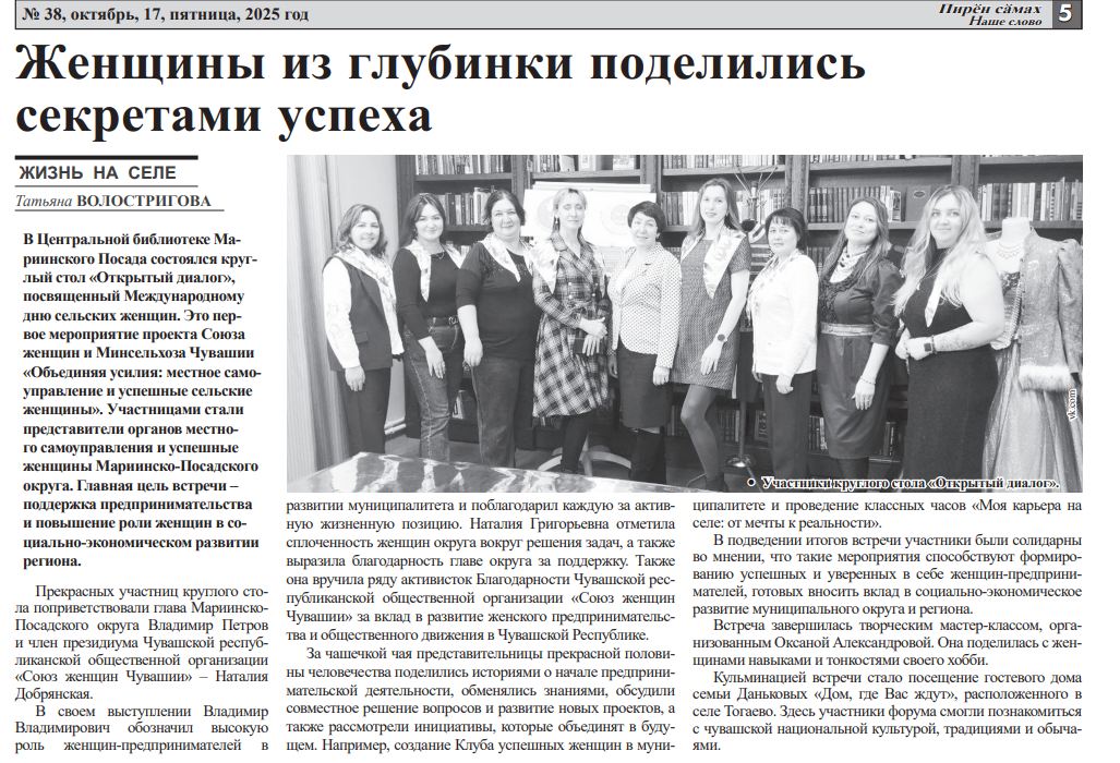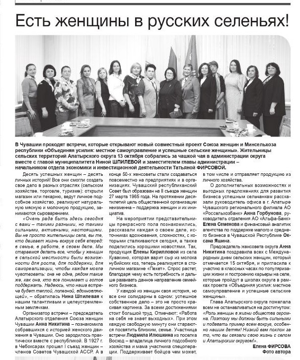 В районных газетах Чувашии часто появляются публикации о наших союзницах и о проектах, реализуемых активистками республики. Вторая половина октября не стала исключением. В этот период районные СМИ публиковали интересные статьи о проекте Союза женщин и Минсельхоза Чувашии «Объединяя усилия: местное самоуправление и успешные сельские женщины».