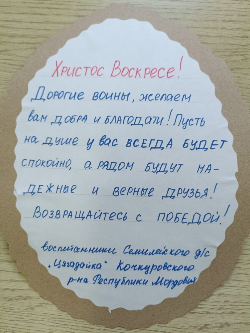 В преддверии Светлого праздника Пасхи воспитанники дошкольных учреждений Кочкуровского муниципального района Республики Мордовия приняли активное участие в патриотической акции «Пасхальное письмо солдату», организованной районным отделением Союза женщин Мордовии.