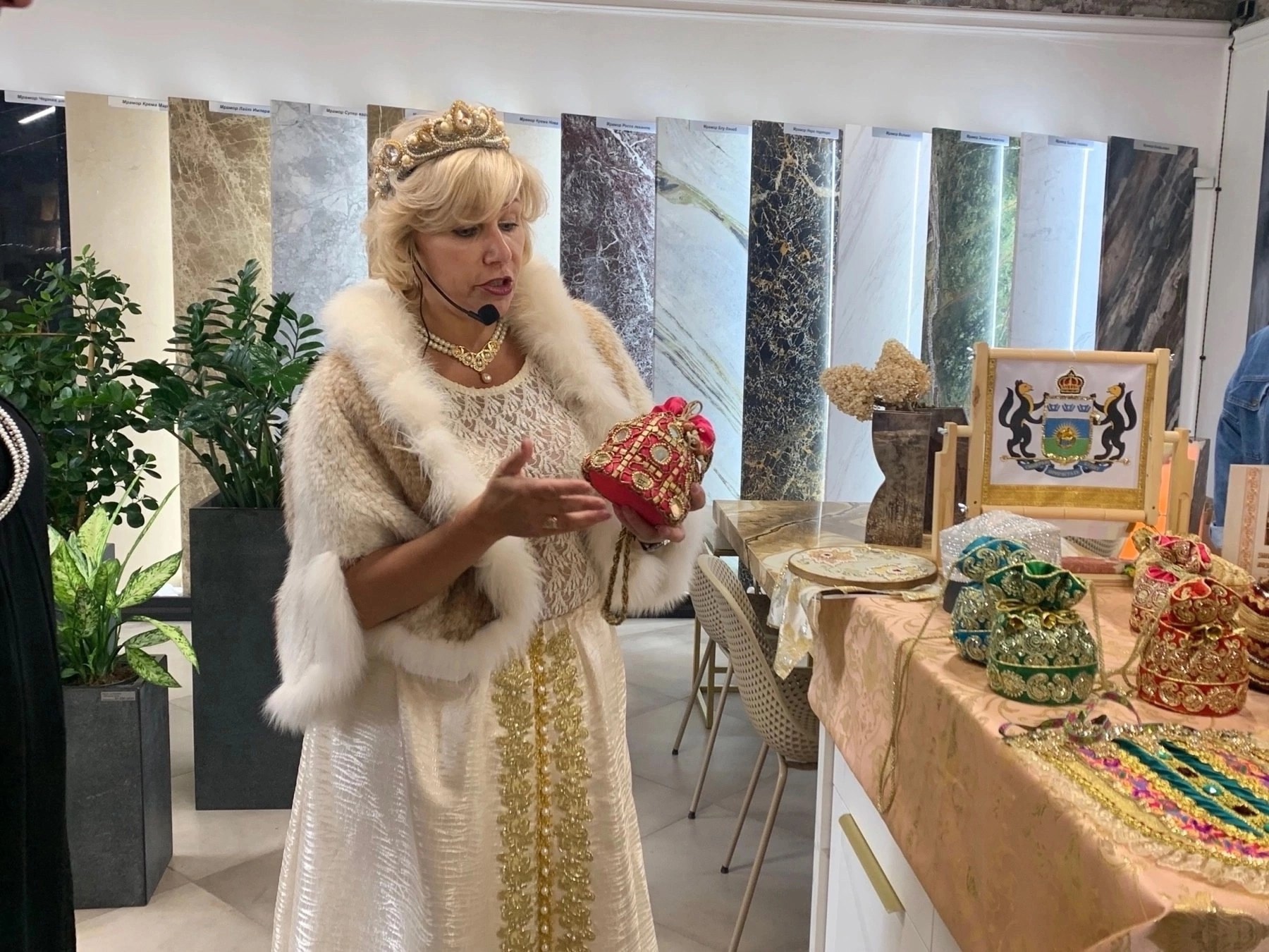 Елена Сулейманова подарила руководителю Центра гражданско-патриотического воспитания «Каравелла» каталог «Культурно-историческое наследие золотного шитья Сибири», который был издан при поддержке Президентского фонда культурных инициатив. Посол культуры СЖР отметила, что Клуб продолжает сохранять народные традиции золотной вышивки народов России.
