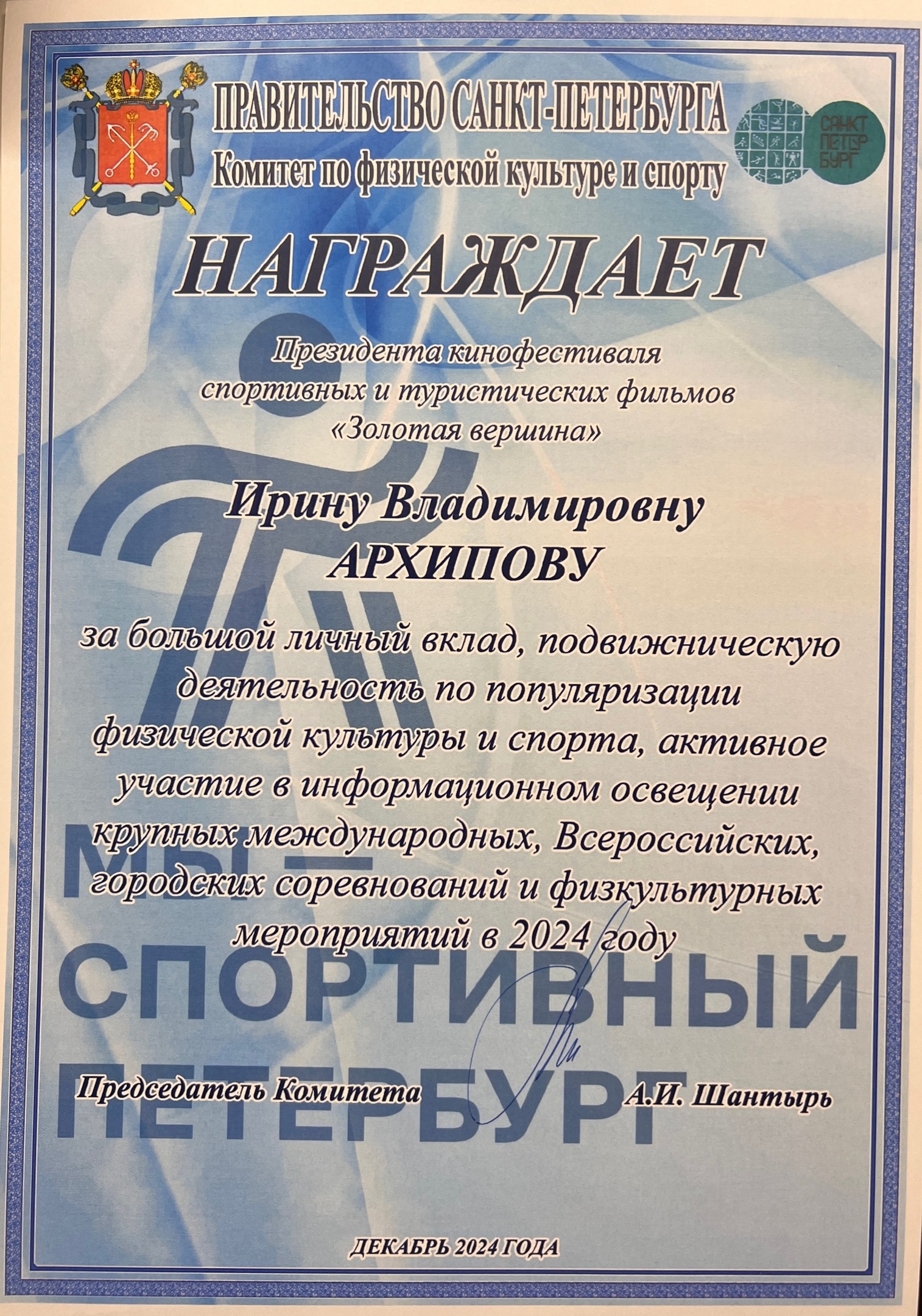Комитет по физической культуре и спорту Санкт-Петербурга в лице председателя Шантырь Антона Игоревича наградил президента кинофестиваля спортивных и туристических фильмов «Золотая вершина», Посла культуры Союза женщин России, председателя Совета Клуба послов культуры СЖР Ирину Владимировну Архипову за большой личный вклад, подвижническую деятельность по популяризации физической культуры и спорта, активное участие в информационном освещении крупных международных, Всероссийских, городских соревнований и физкультурных мероприятий в 2024 году.
