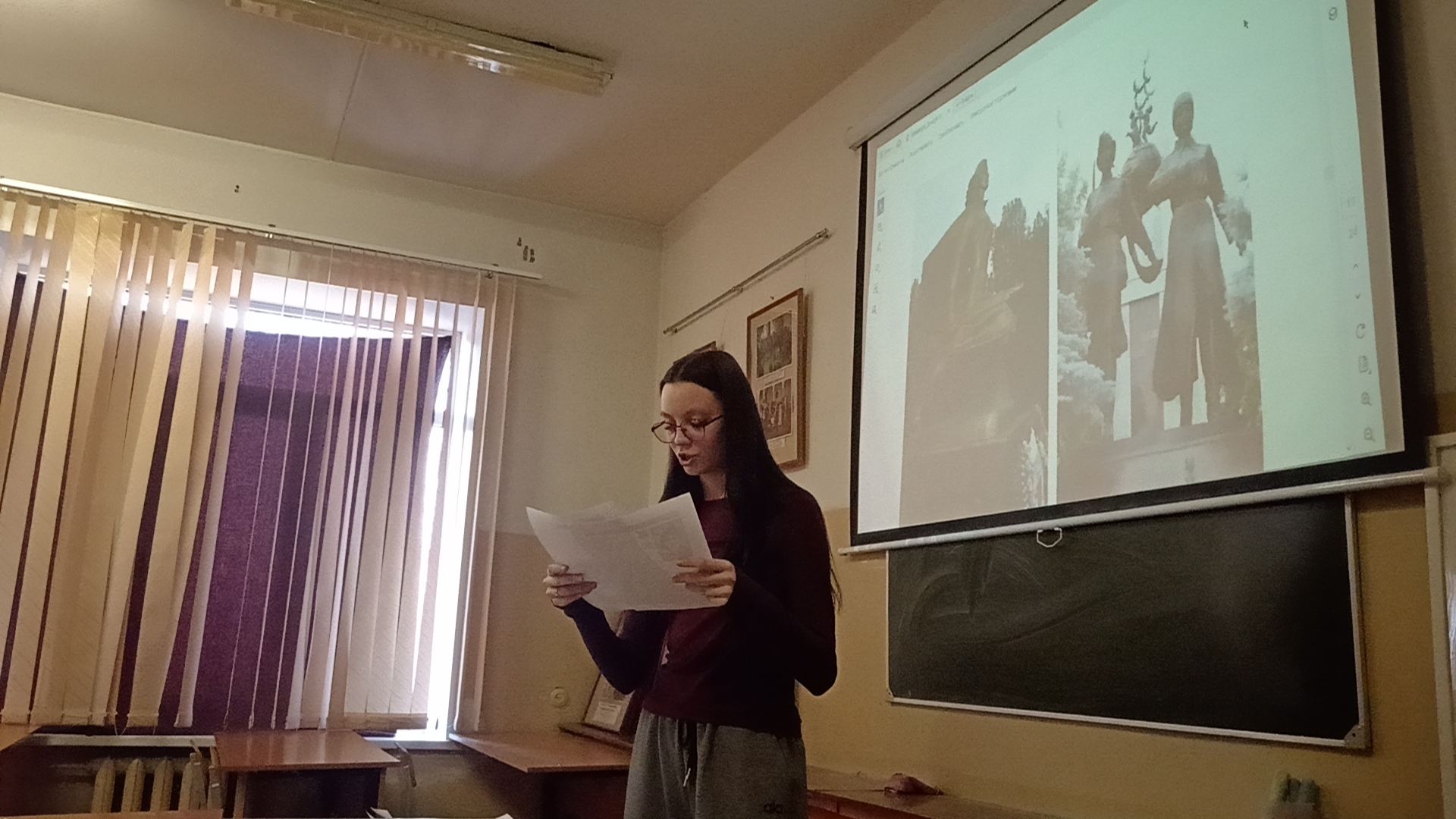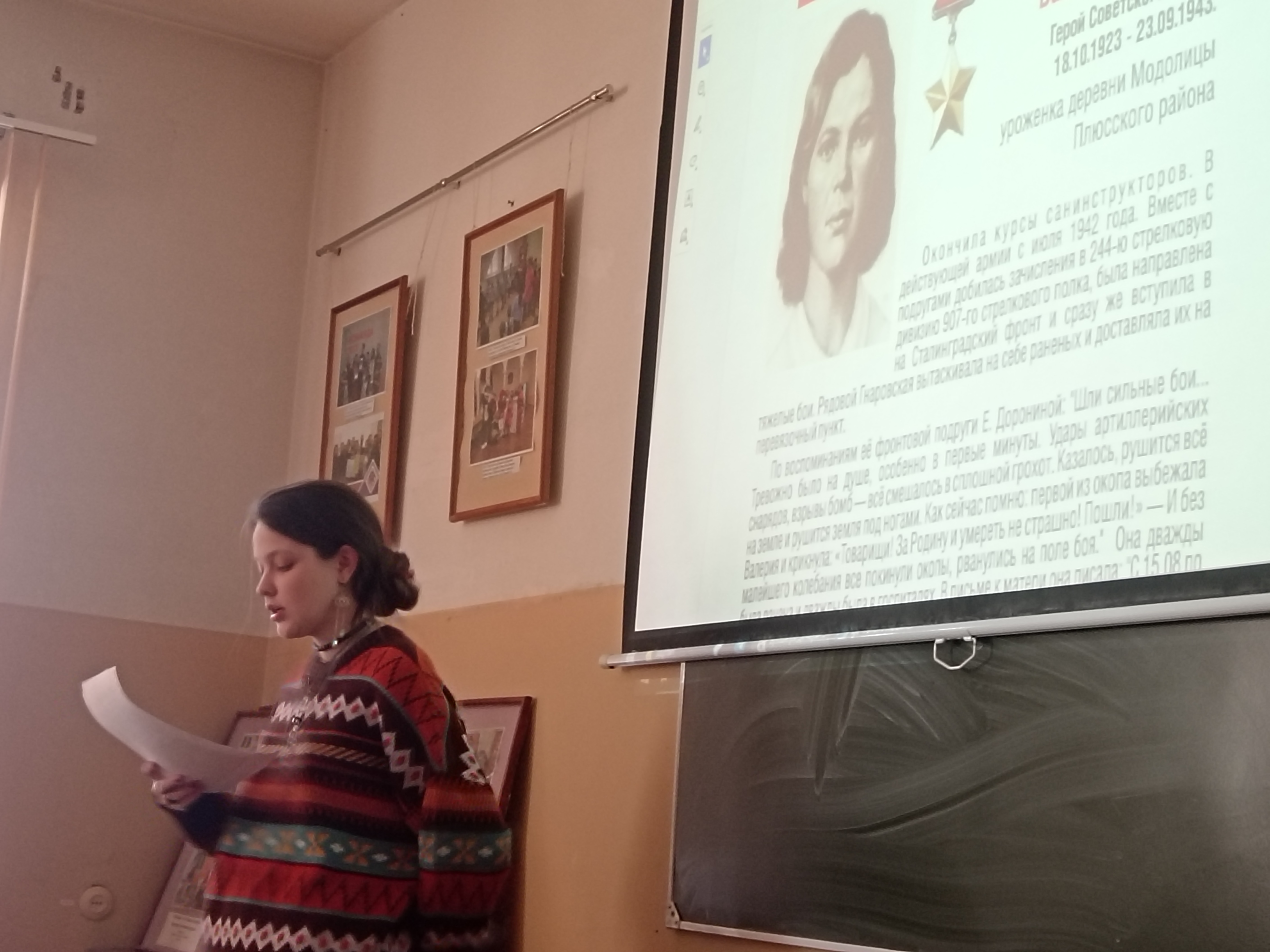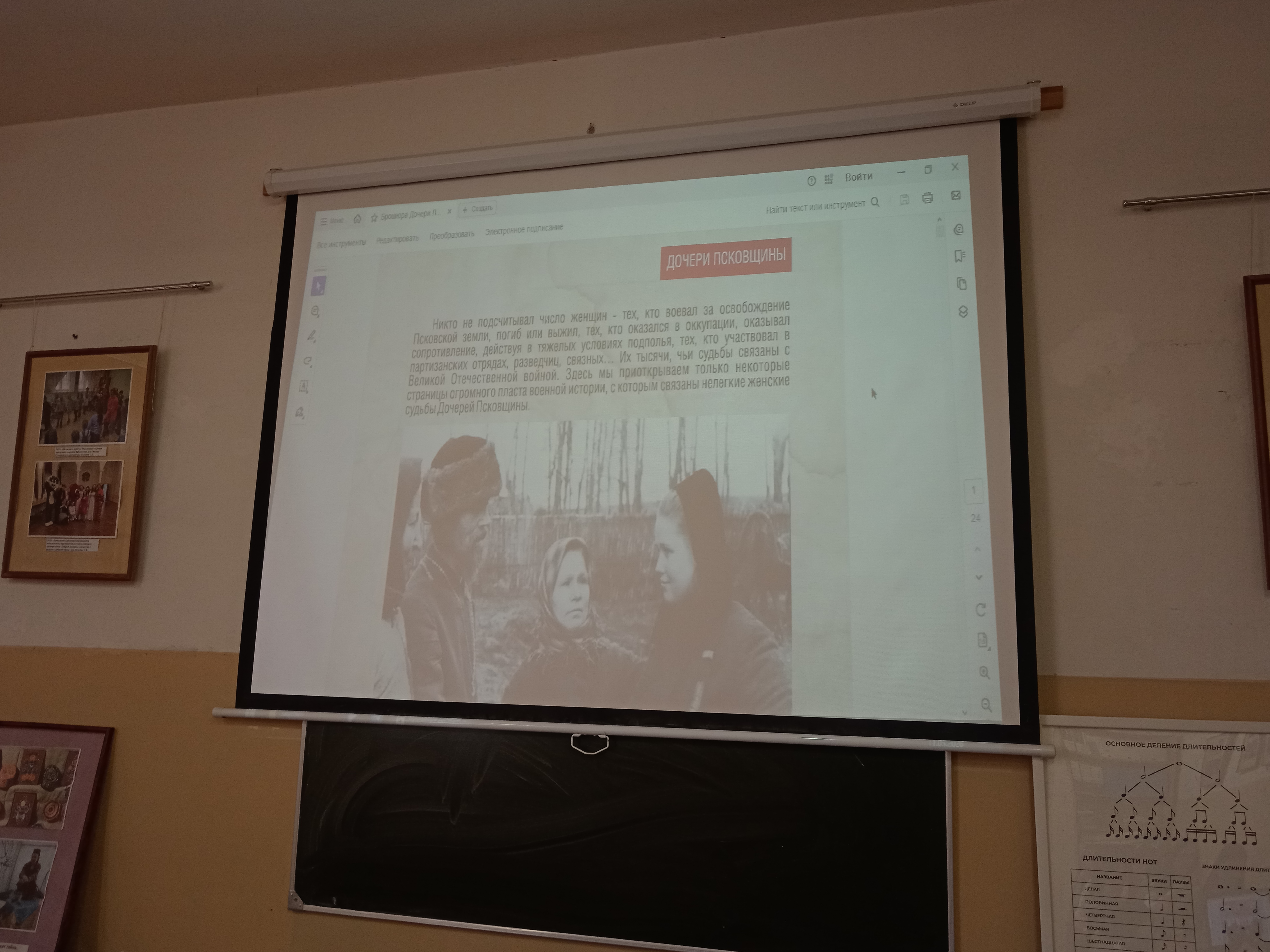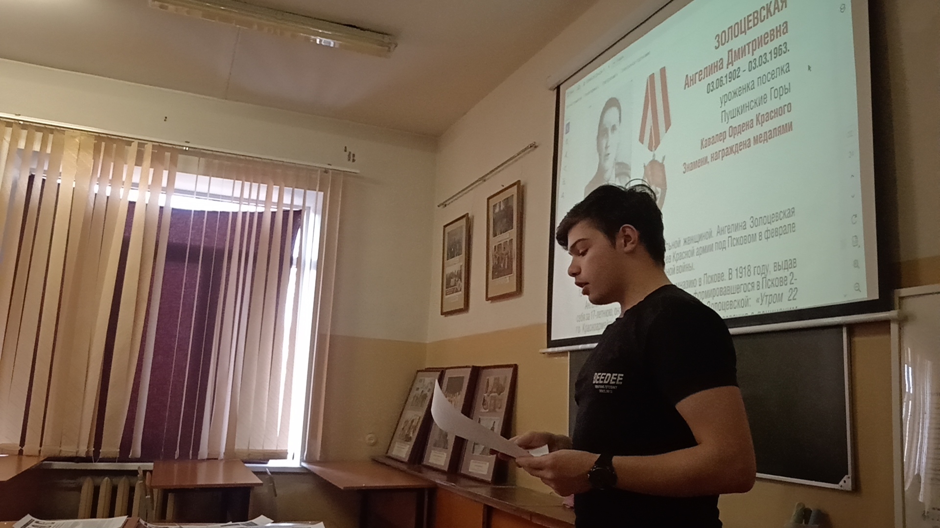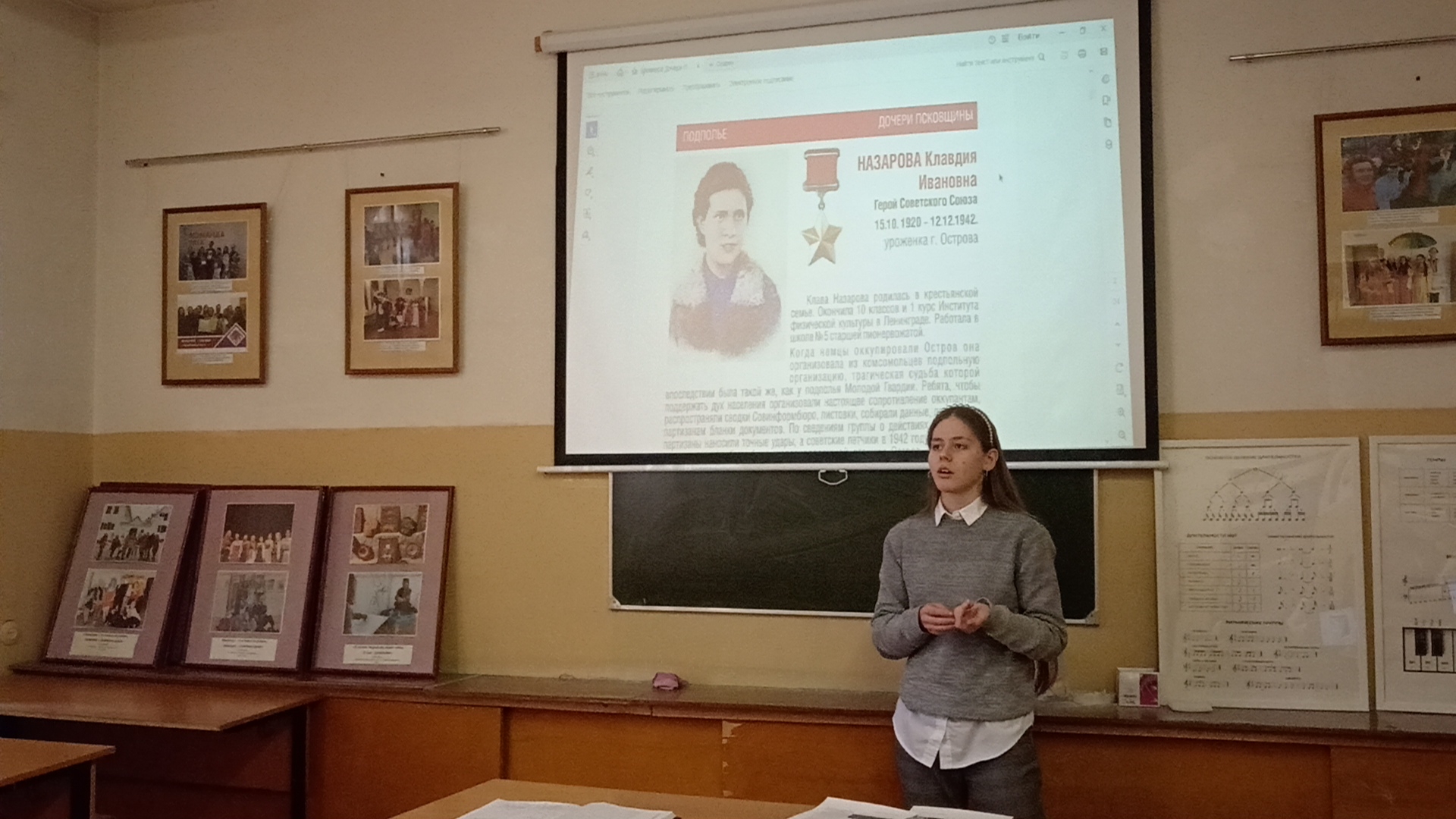 Она рассказала, что по инициативе преподавателя, Посла культуры СЖР Снежаны Власовой в Псковском колледже искусств им. Римского-Корсакова в рамках года 85-летия Антифашистского комитета советских женщин организованы пять уроков мужества.