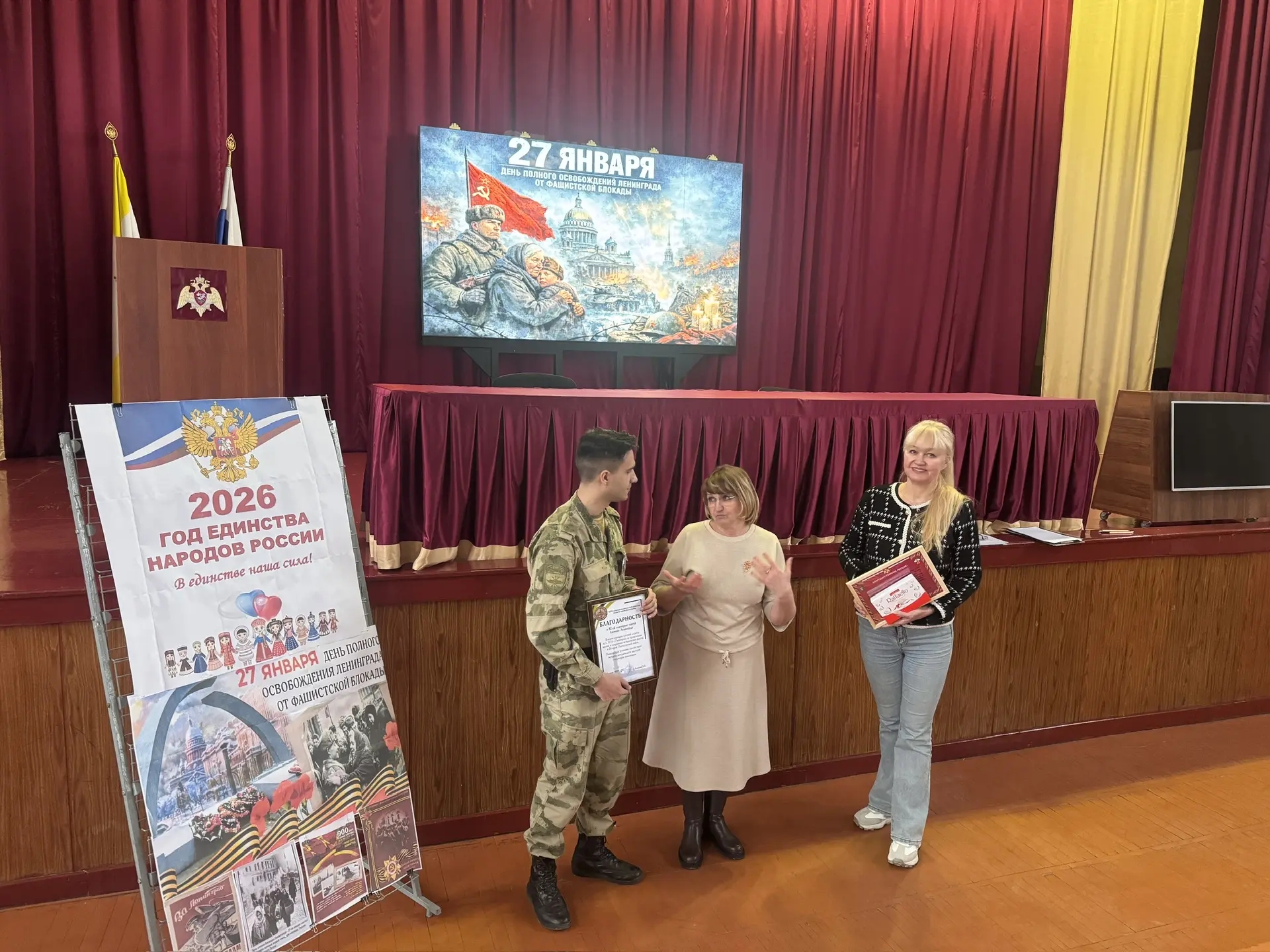 Заведующий библиотекой-филиалом-4 им. А. Губина, член женсовета посёлка Горячеводский Наталья Рядская и председатель поселкового женсовета Елена Кучмасева рассказали военнослужащим срочной службы о тех страшных 900 днях боли и страданий, мужества и самоотверженности людей и о том, как героический город, пройдя через нечеловеческие испытания, выстоял, а его жители и защитники дали отпор врагу и показали всему миру величайший пример героизма.