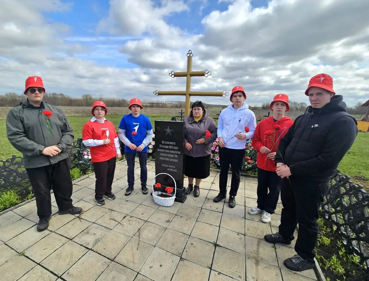 А со старшеклассниками - активистами "Движения Первых" наша подруга провела Урок мужества «Сроку давности не подлежит». Мероприятие проходило у памятника узникам Шатиловского фильтрационного лагеря в деревне Ивановка. В марте 2026 года здесь были захоронены останки, найденные летом 2025 года в ходе поисковых работ в рамках межрегиональной Вахты Памяти. Школьники почтили минутой молчания память погибших и возложили цветы к монументу.